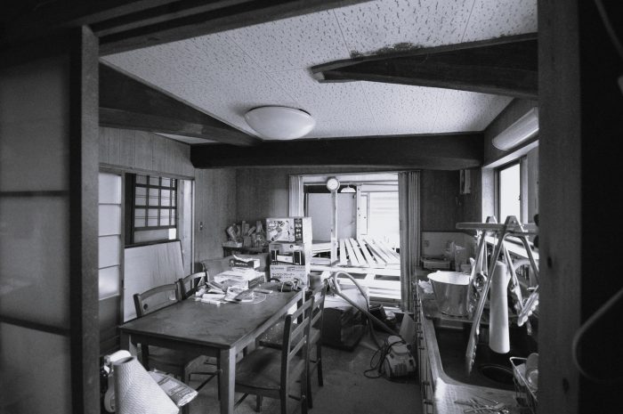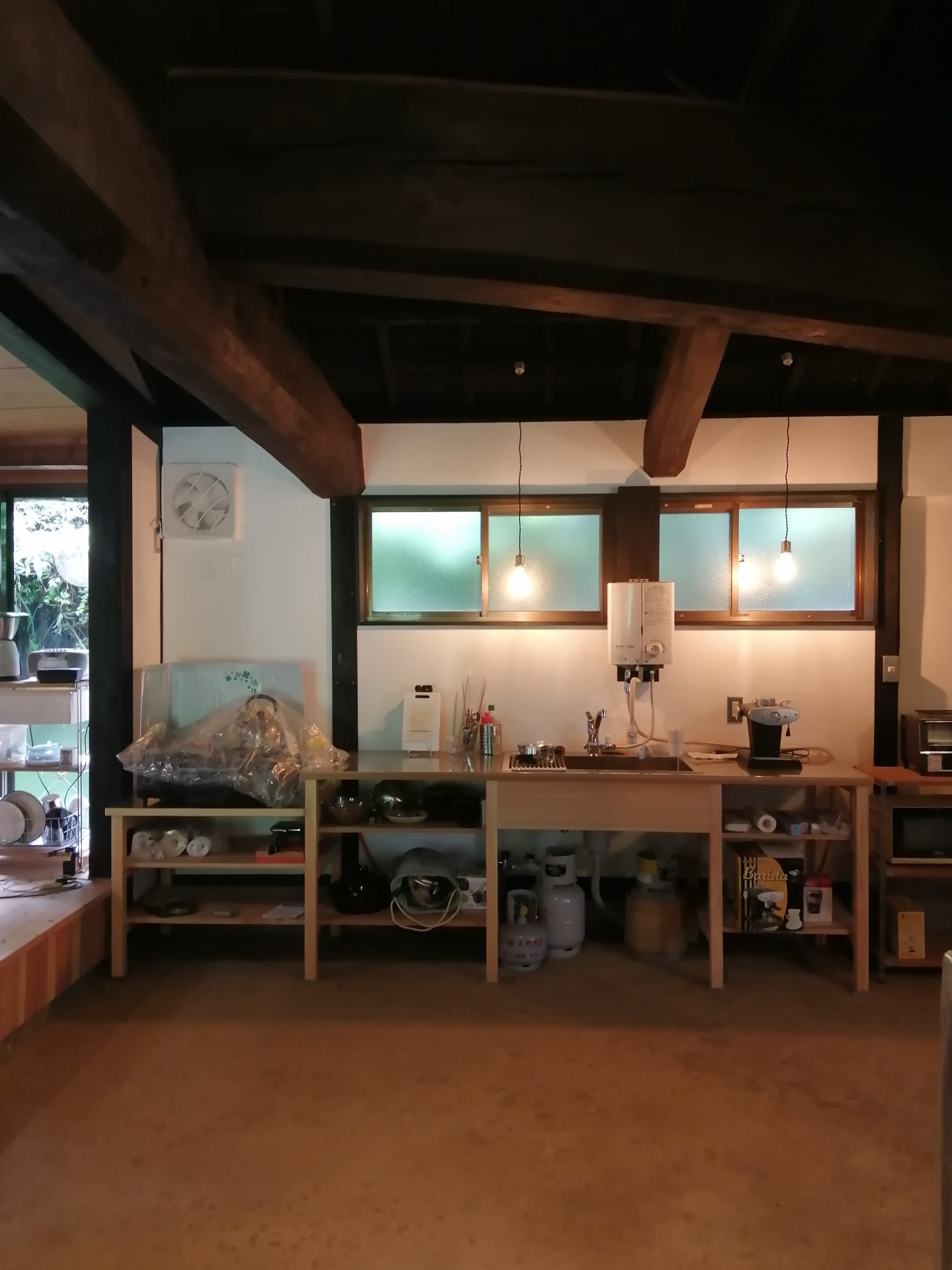 三ケ野の古民家 リフォーム 雨漏り・シロアリで傷んでいた箇所を補修。昭和の改装がされていた内装を解体、吹き抜け・三和土に。三和土は施主様も含め、ワークショップ形式で施工。そこに造作キッチン、キッチンストーブを据え付けた。