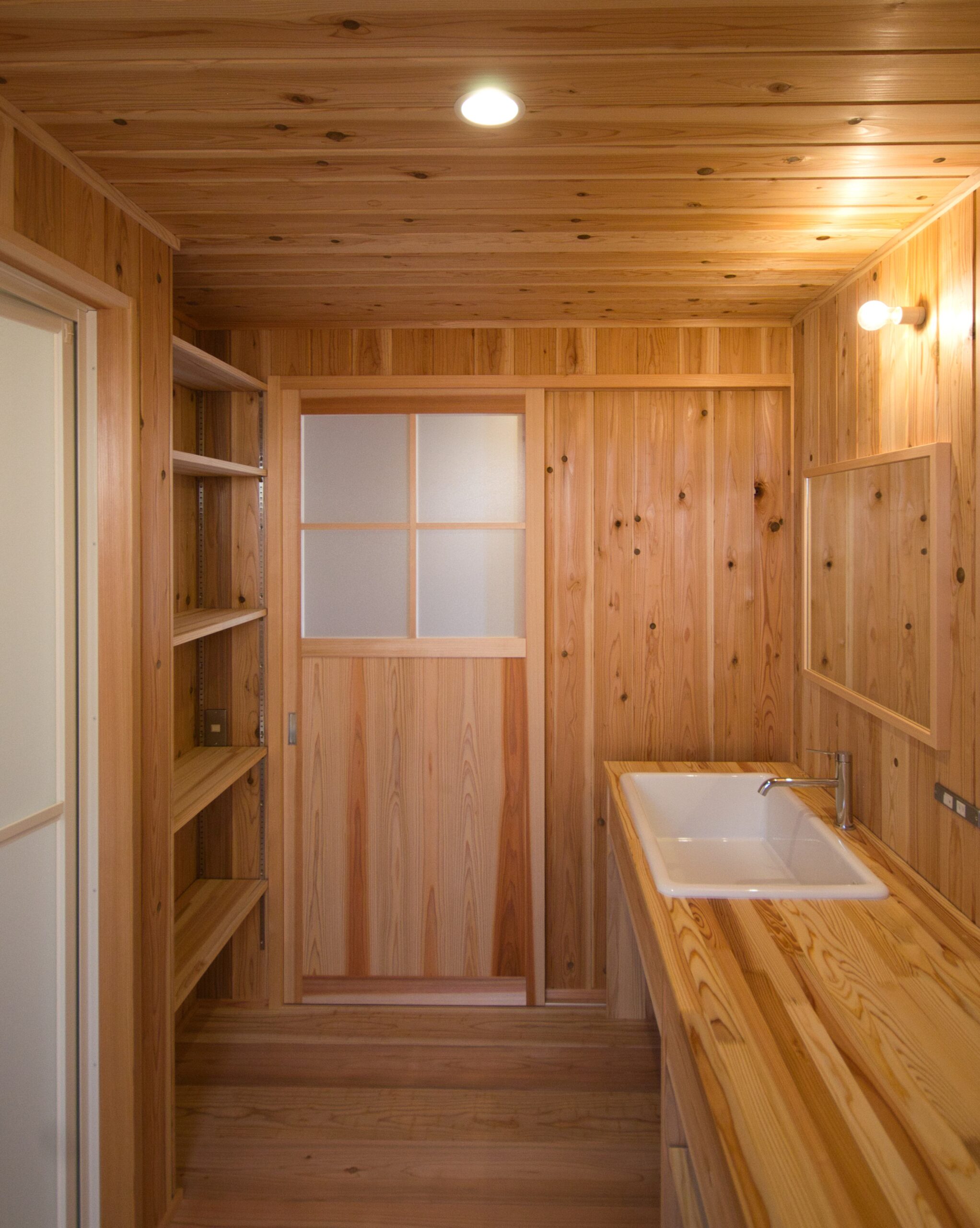 天井/1Fは杉羽目板11mm ロフトは杉40mm野地板現し