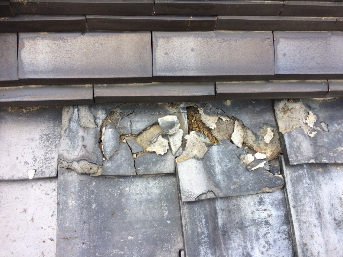 雨漏りの原因は、瓦が凍てて割れて、そこから雨が侵入していることによる。