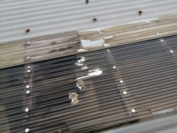 おおよそ張り替えた波板。ガルバリウム波板の部分は、色はくすんでいるが、錆びもあまり見られず、まだまだ大丈夫だ。