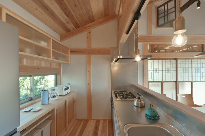 | 外部 | 屋根:ガルバリウム立平葺き 壁:杉赤板目板押え(ウッドロングエコ塗布)+土壁大直し 開口部:木製建具(玄関=古建具利用)+アルミサッシ |