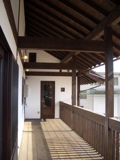 ティンバーフレームを模した住まい 竣工:2006年設計:高橋一浩/高橋建築工房施工:高橋建築工房、一部分離発注工事 構造木造2階建てロフト付き、プレカット+手加工外部屋瓦: 陶器瓦外壁:漆喰、杉赤南京下見張り/プラネットカラー塗装内部床:杉30mmフロア壁:漆喰+腰張り板(杉)天井:杉羽目板、杉床板現し板部塗装:プラネットカラー、柿渋塗料他2世帯住宅。 ティンバーフレームを模した住まい